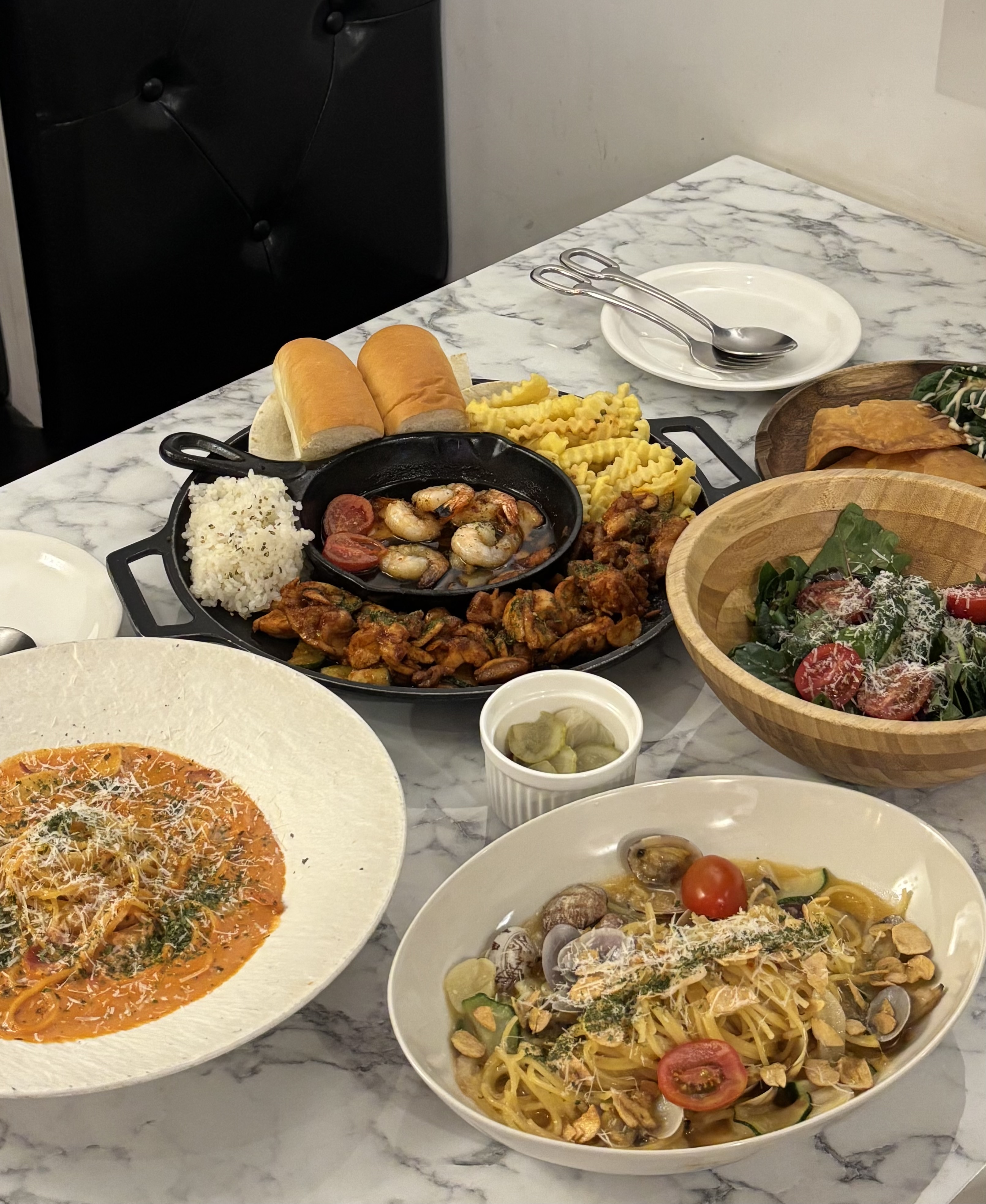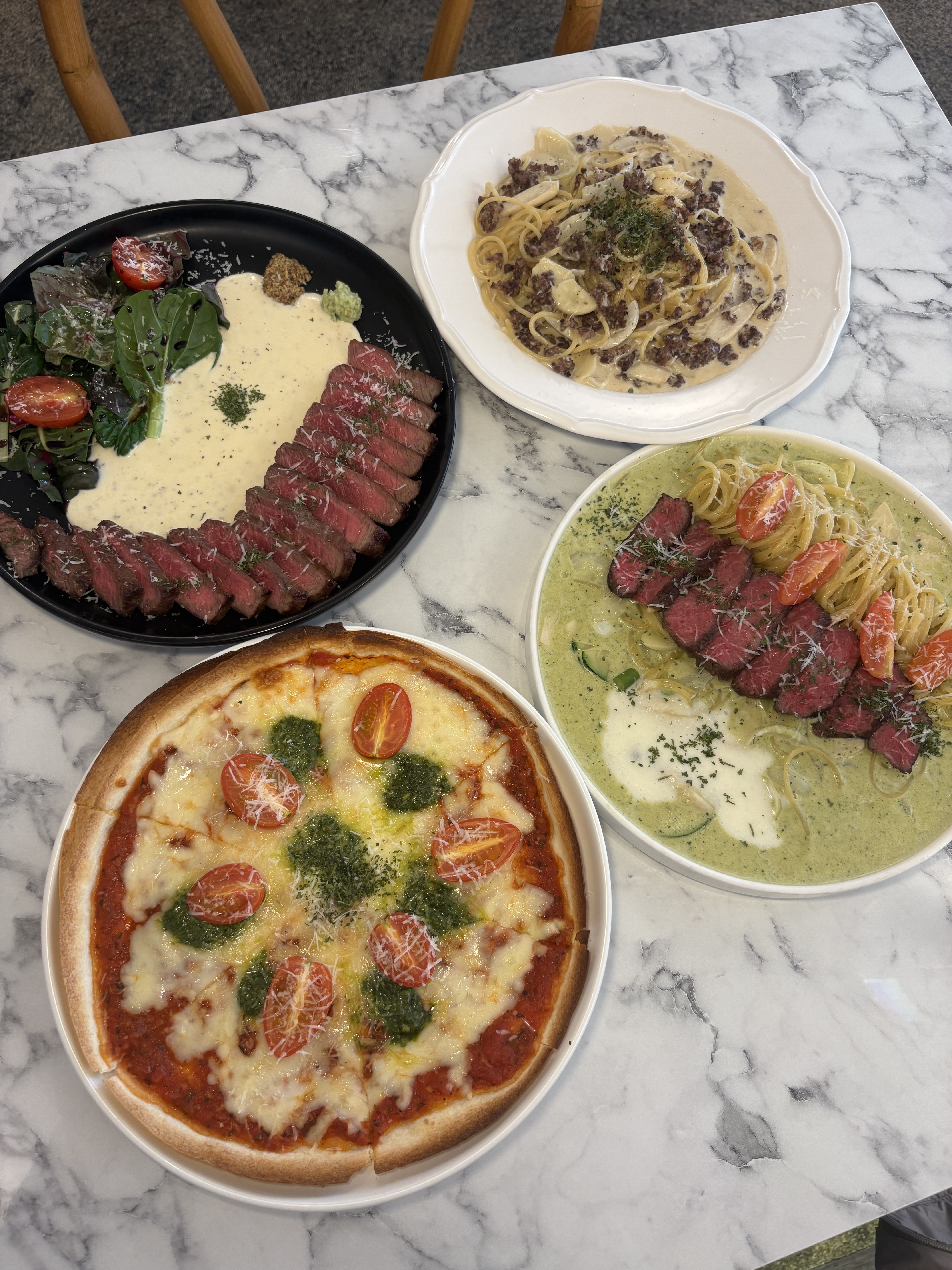 시그니처 스테이크는 육즙이 살아 있고 부드러워서 메인으로 딱이었어요. 부채살 스테이크 바질크림파스타는 고소한 크림에 바질 향이 은은하게 어우러져 부담 없이 먹기 좋았습니다. 마레빠에야가 매콤해서 다른 메뉴들과 잘 어울리는 맛이었습니당