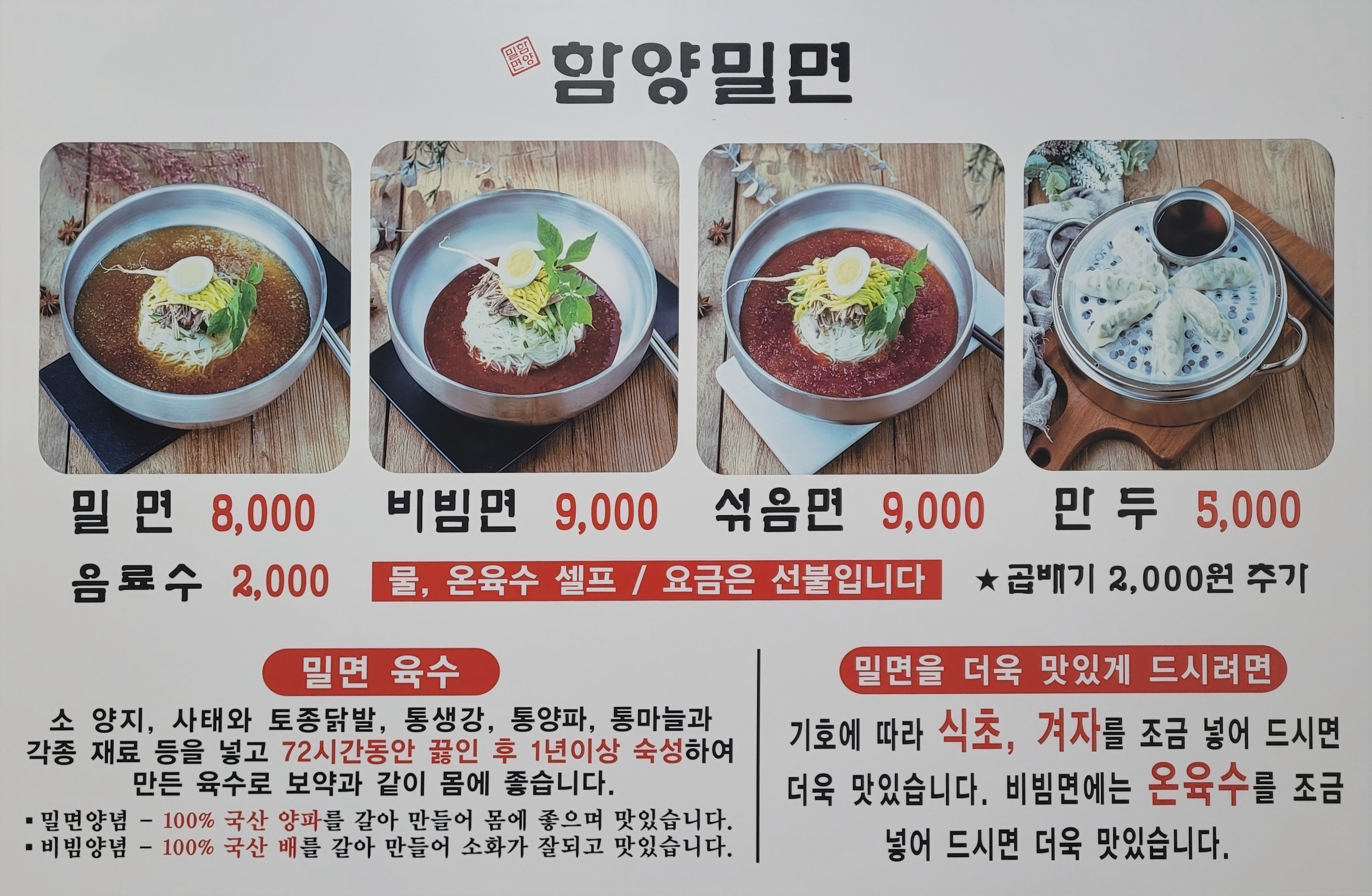 - 곱배기추가(밀면,비빔면,섞음면) 3,000원