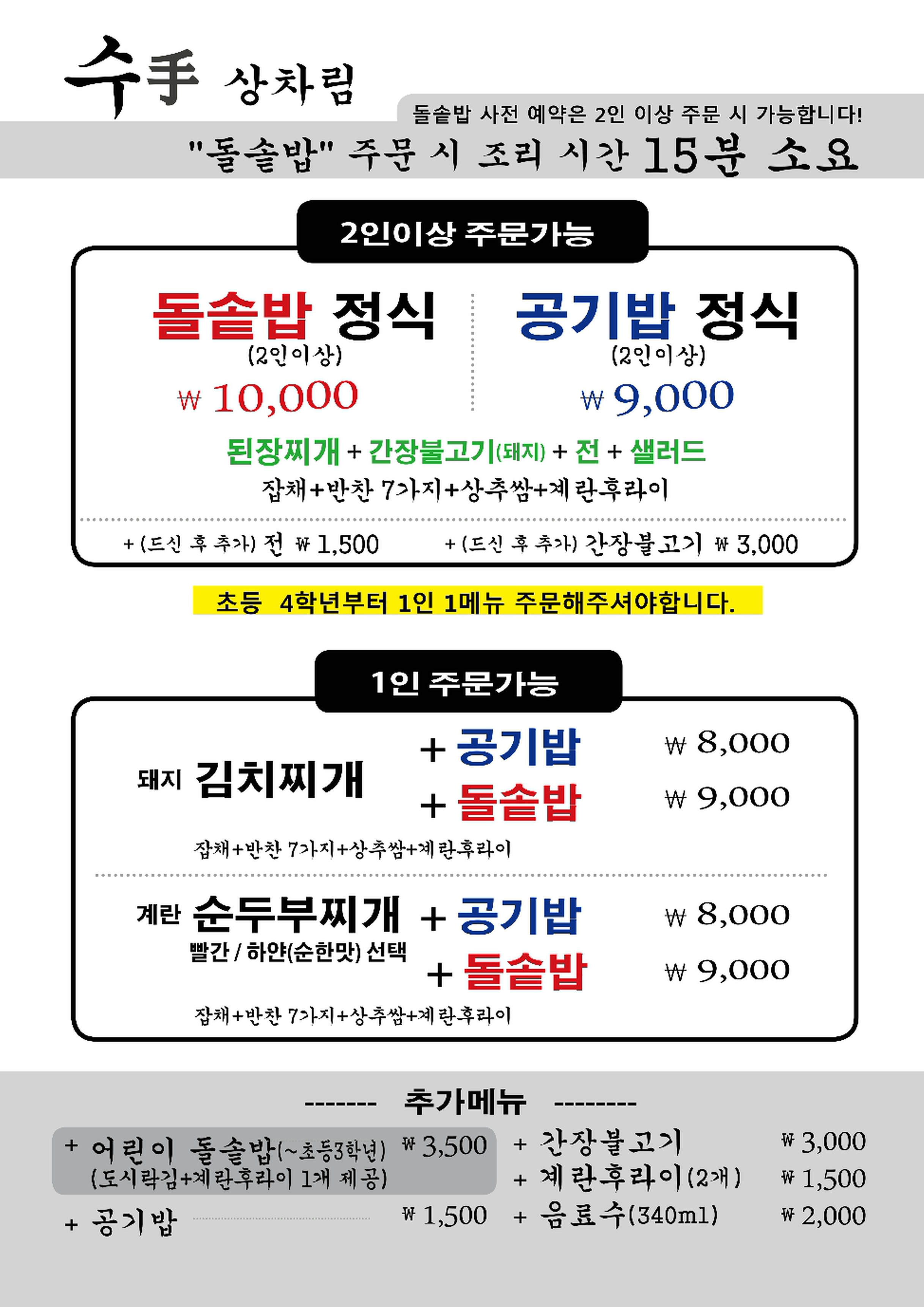 - (빨간/하얀) 순두부찌개+돌솥밥 9,000원