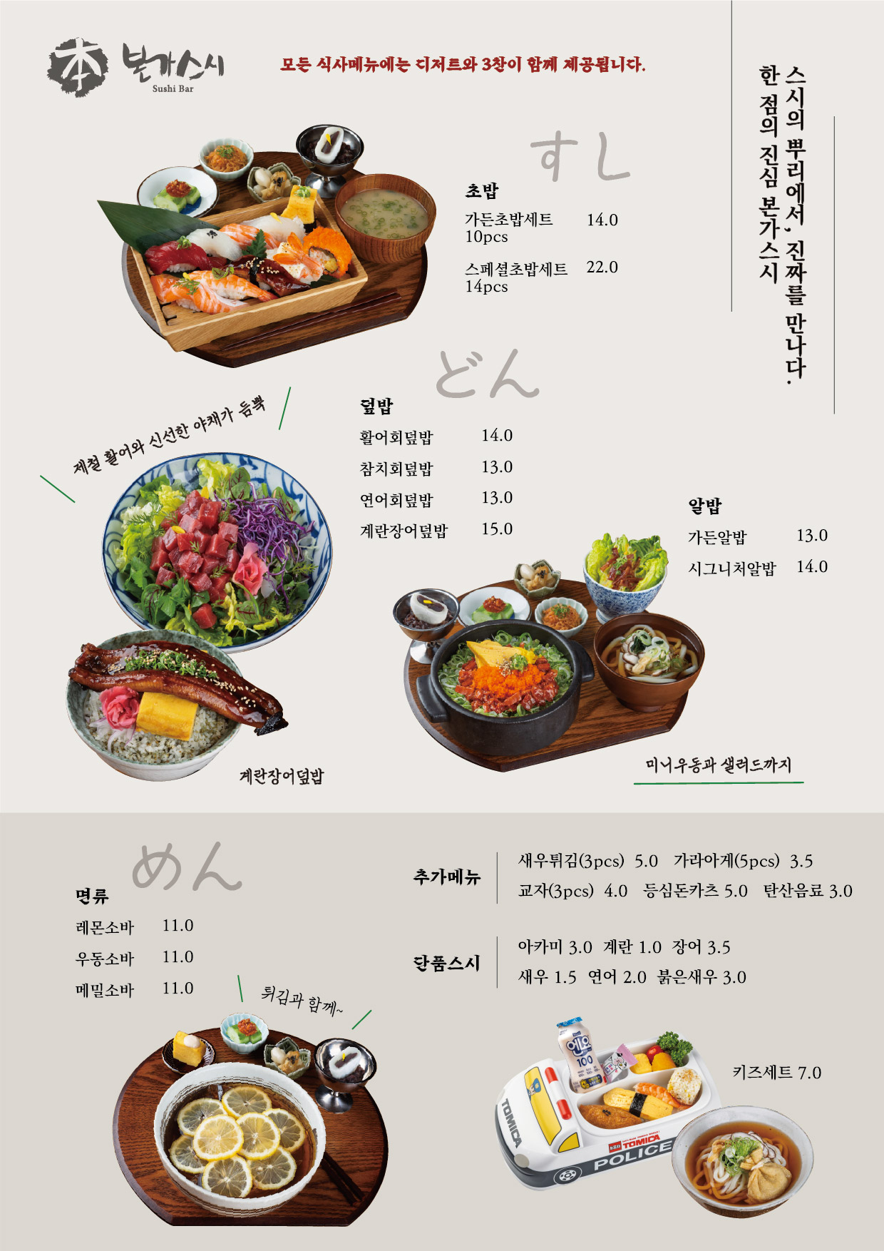 아임파파4아이가 좋아해서 올때마다 들르는 곳. 메뉴가 좀 바뀌어서 우동은 따로 시켜야했지만 초밥 구성도 다양하고 아이 위해 와사비 빼달라 요청드리니 따로 주시고 친절하고 맛도 좋습니다. 좌석도 넓어 조용히 혼밥하기도 둘이 같이 먹기에도 좋은 분위기예요.