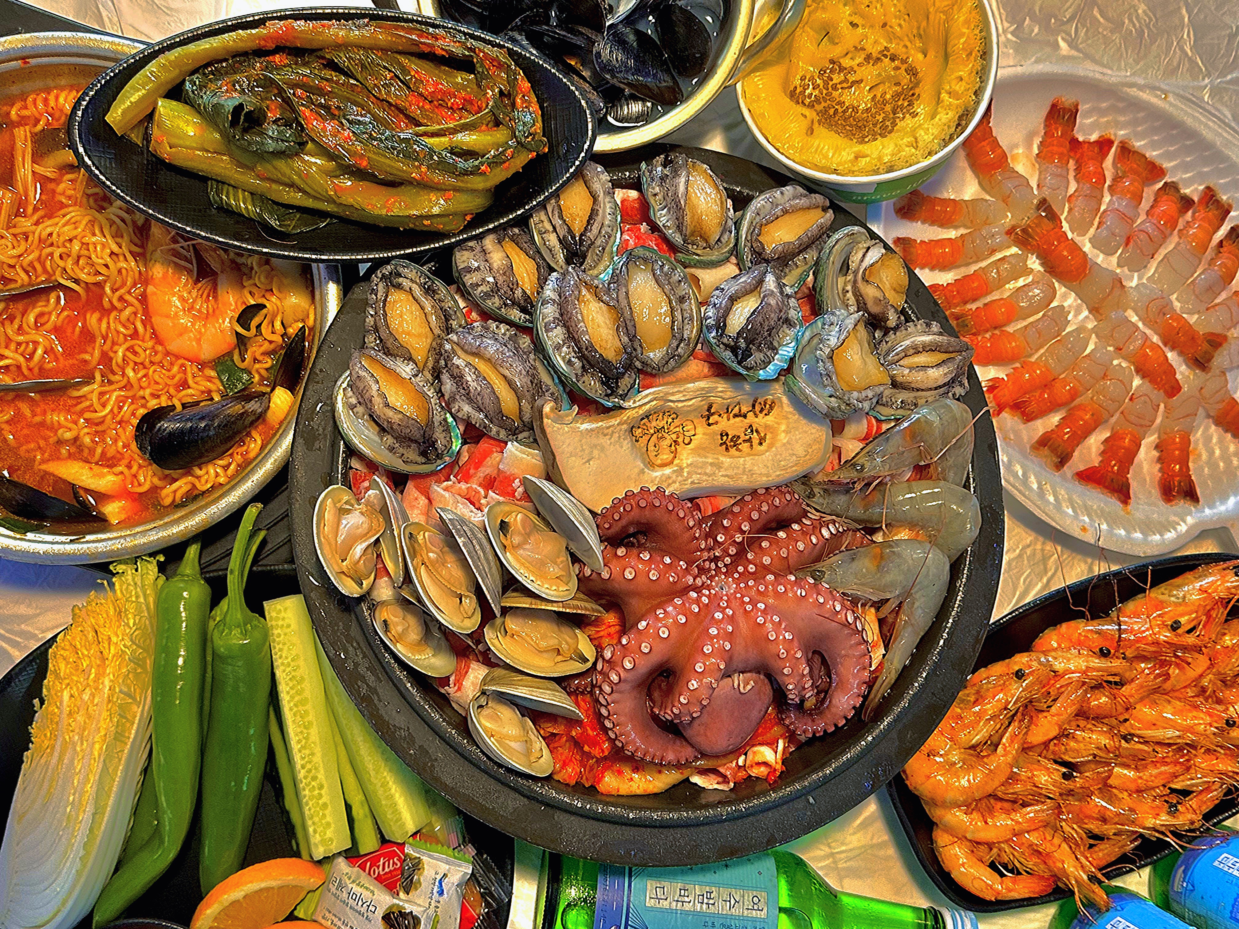 jul****일단 양이 정말 많았어요!! 그리고 앉으면 바로 과일접시를 가져다 주시는데 너무 신선하고 남으면 싸갈수 있어서 좋았어용 그리고 삼합이랑 같이 서비스로 새우버터구이를 주시더라고요 새우도 정말 크고 너무 맛있었어요!! 삼합은 재료가 많고 김치도 아낌없이 많이 들어가있고 고기도 너무 많고 문어도 진짜 크고 진짜 부드러워서 너무 만족스럽게 먹었습니다! 사이드 해물라면에도 해물 많이 들어가 있어서 해물 배터지게 먹었네용