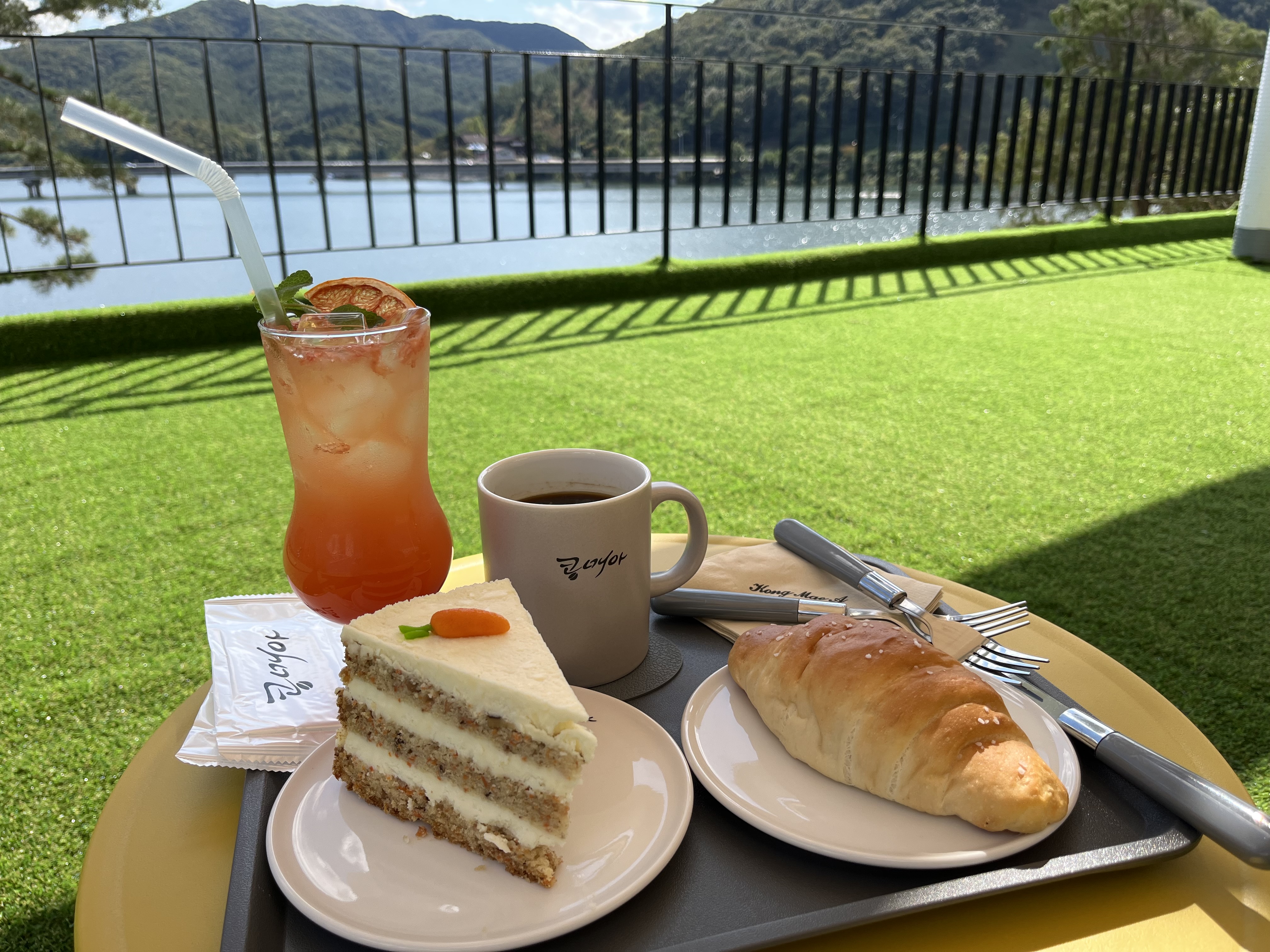 김복잘콩밭매는 아낙네의 줄임말이라는 곳, 칠갑전망대와 스카이워크가 보이는 칠갑저수지뷰 카페 콩매아! 청양 여행왔다가 스카이워크 걷고 몸녹이러 들어왔는데 평일이라 한적하고 물멍할 수 있어서 좋아요. 알프스마을이랑도 가깝고 뷰좋고 의자가 편해서 굿굿 스카이워크 방문하면 주는 지역화폐듀 쓸 수 있고 청양 특산물 이용한 메뉴들도 있어서 좋은 카페인 것 같습니다. 사장님도 친절하시고 외부에도 자리가 있는데 추워서 내부에서 먹구갑니닷 👋